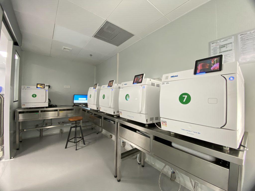 中山大学附属口腔医院(华利路)新院区,地址位于广州市天河区珠江新城保利大厦(华政街南)56号。于2025年10月17日在消毒供应中心安置了 5 台德国 MELAG Vacuklav 44B + 台式蒸汽灭菌器和 3 台 Miele 清洗消毒机投入使用。